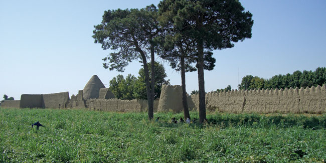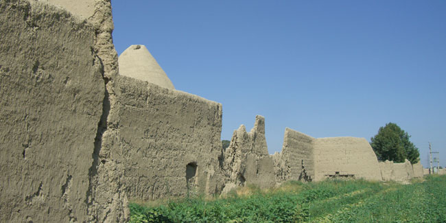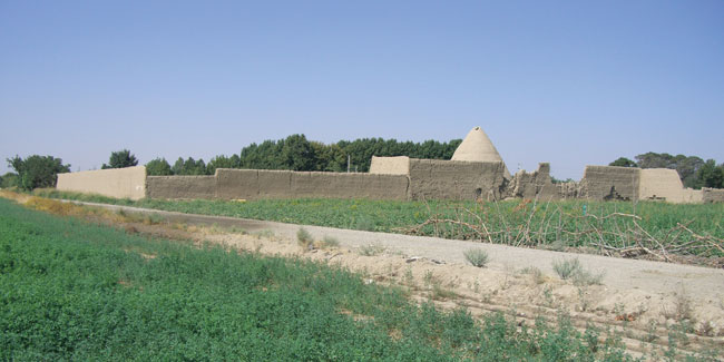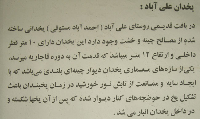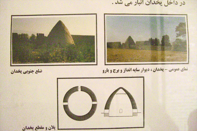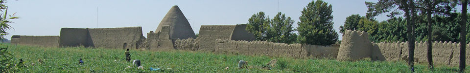 Notes: In the nearby museum at Robat Karim a poster with a description and photographs of this ice house was found. However, when checking with my (rough) field distances and dimensions, it is found that the museum information is not correct, and my field values were recorded. Only the ice house dome seems to have been restored, the walls are left to decay. So National Registration does not mean conservation of walls. The ice house is on a flat open plain with fertile fields around. There is a cucumber field on the north side. The ice house complex now appears part of a private property with no access, fenced off by supplementary garden wall. |
