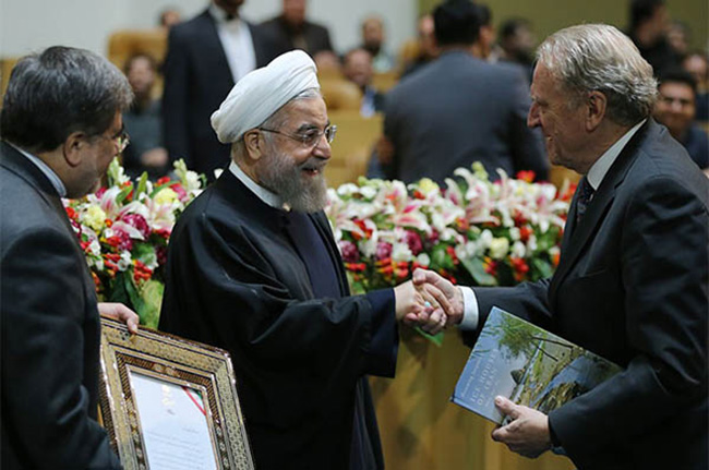 | President Hassan Rouhani honors Danish scolar Hemming Jorgensen (1st from right) for his book “Ice Houses of Iran” during Iran’s Book of the Year Awards ceremony in Teheran on February 8, 2015. | Culture Minister Ali Jannati (2nd from left) and Deputy Culture Minister for Cultural Affairs seyyed Abbas Salehi are also seen in the photo, (IRNA/Saraj Samadi) |